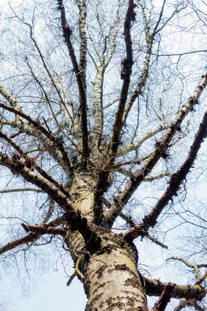 Tree trunk and branches without leaves on blue sky backgrounds taken from the low point of view and look upwards toward the top. Spring tree crowns.