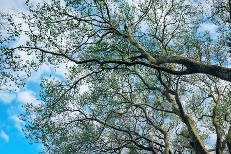 An upward view of a majestic, ancient tree with thick, gnarled branches stretching out, covered in lush green leaves, creating a canopy against the sky.
