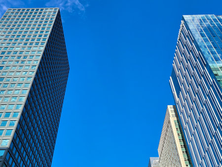An upward perspective captures multiple skyscrapers against a clear, sunny sky. The buildings display reflective surfaces and repeating patterns, bathed in natural light. The composition emphasizes height and scale, hinting at urban environments and commercial activity, suitable for various uses.