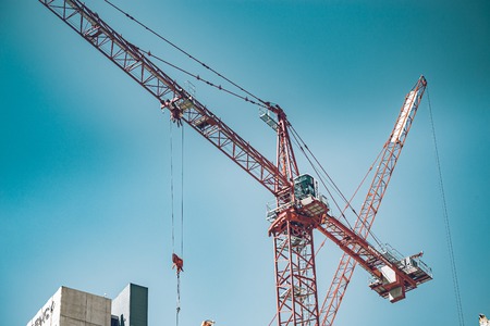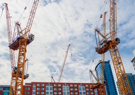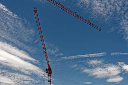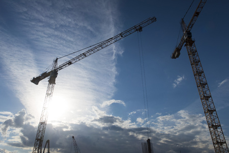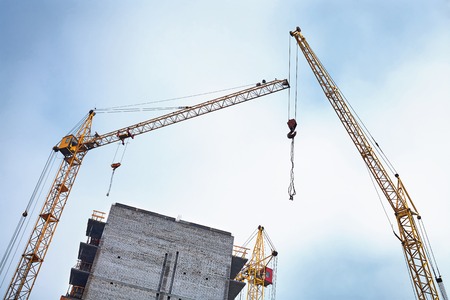 photographed close-up construction cranes during construction of a new multi-storey apartment building, blue sky and clouds,