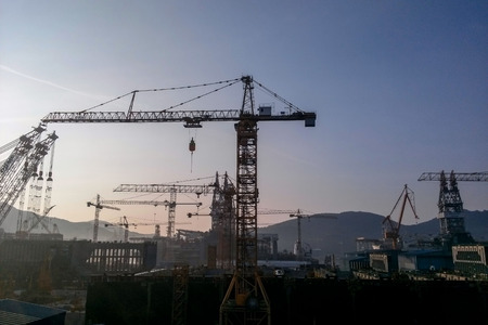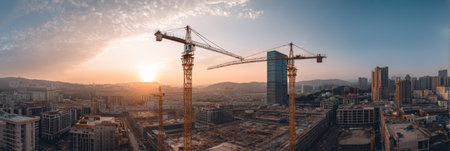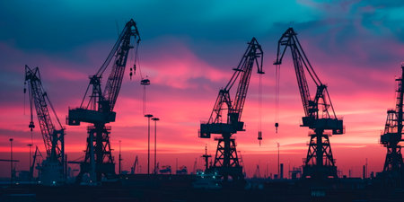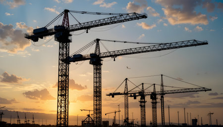 industrial construction site at sunset, conveying silhouettes of cranes and structures.