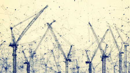 This abstract image showcases construction cranes intricately intertwined with geometric lines, symbolizing modern industry and urban development.