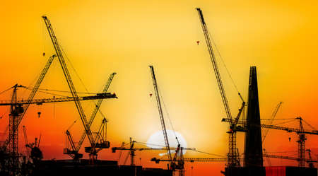 Silhouette of construction cranes over new construction landmark buildings at sunset. Urban background