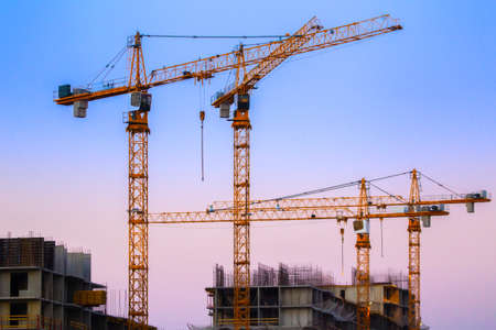 Jib construction tower crane and new residential buildings at a construction site on the sunset and blue sky background - Image
