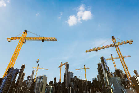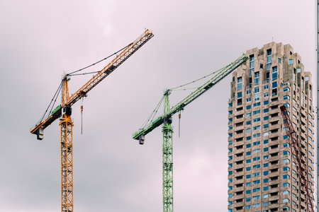 construction tower cranes are building new apartment buildings in a residential area of the metropolis