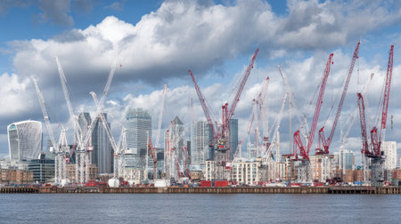 A bustling construction site showcasing numerous cranes towering over a modern skyline under a cloud-filled sky, symbolizing growth and urban development.