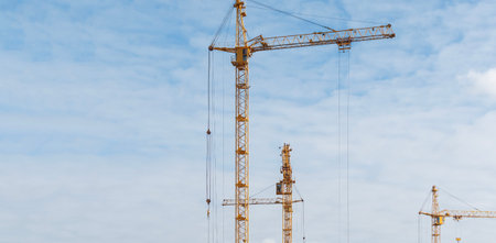 Majestic Tower Cranes Against a Bright Blue Sky in an Urban Construction Site Setting