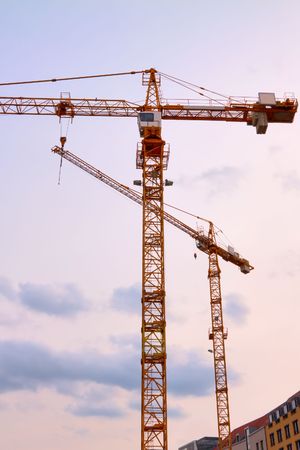 Two construction cranes are positioned against a serene, pastel-colored sky. Their design exhibits a minimalist aesthetic. The image uses a muted color palette. This image may be used for a variety of commercial and editorial purposes.