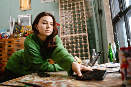 Young woman using cellphone and laptop while working in her studio