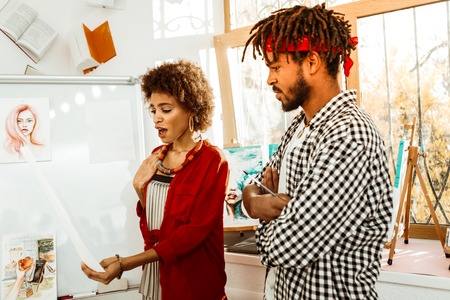 Surprised woman. Stylish curly dark-haired woman feeling surprised seeing picture painted by her man