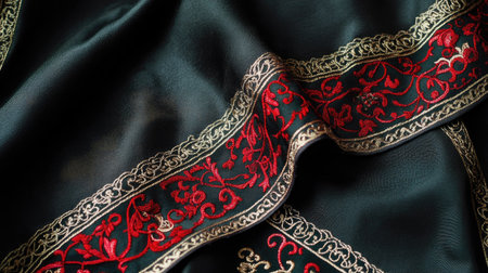 Discover a stunning close-up of elegant black fabric with intricate red embroidery, showcasing rich textures and detailed designs perfect for various creative projects.