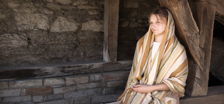 Young adult age poor beggar crisis lone tired seat leisur relax folk veil shawl cloth. despair eye teen kid lady face grief stress failur need pray wait ask beg alm god help faith