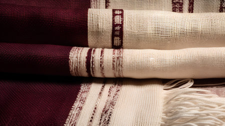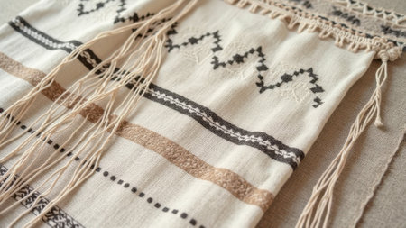 Traditional woven textile with geometric patterns and fringes. That the image is generated using AI.
