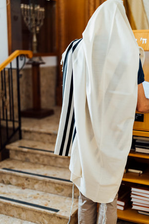 Religious jewish man in white festive attire is covered by a traditional tallit shawl. Jewish prayer male clothing. Celebrating Rosh Hashanah, Passover, Shabbat, Hanukkah, Yom Kippur, Shavuot