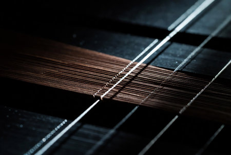 Acoustic guitar strings close up. Selective focus on strings.