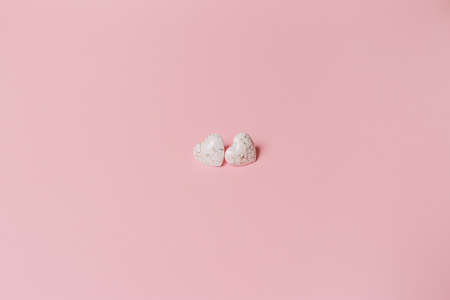 Marshmallows on yellow background with copyspace. Flat lay or top view. Background or texture of colorful mini marshmallows. Winter food background concept.