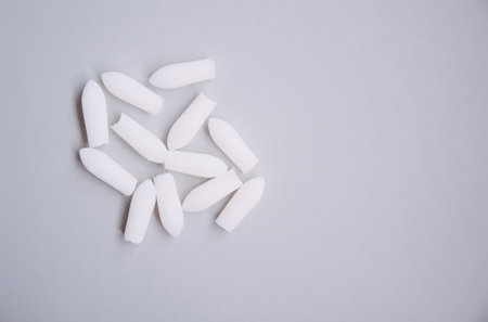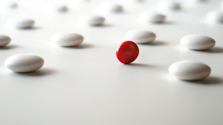 A collection of white and red pills is neatly arranged on top of a table, creating a stark contrast in colors. The pills are various shapes and sizes, placed in a random pattern.