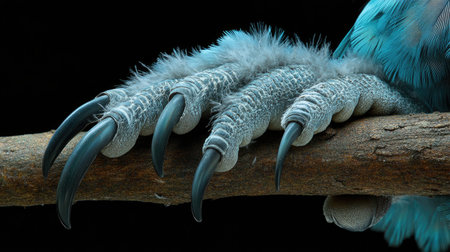 This striking close-up captures a bird's talon gripping a branch, showcasing stunning detail in the feathers and sharp claws against a black backdrop.
