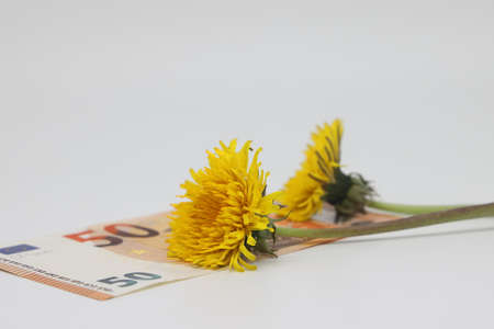 Yellow dandelion lies on a banknote close-up, financial plans in the spring