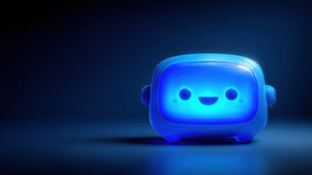 A charming, translucent blue robot with a smiling face emits a soft glow, creating a serene atmosphere in a dimly lit space.