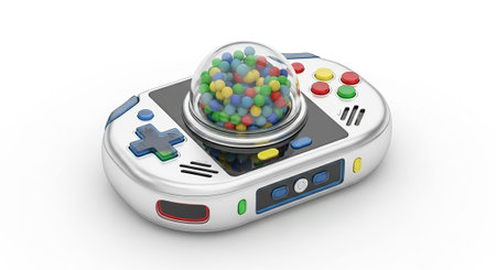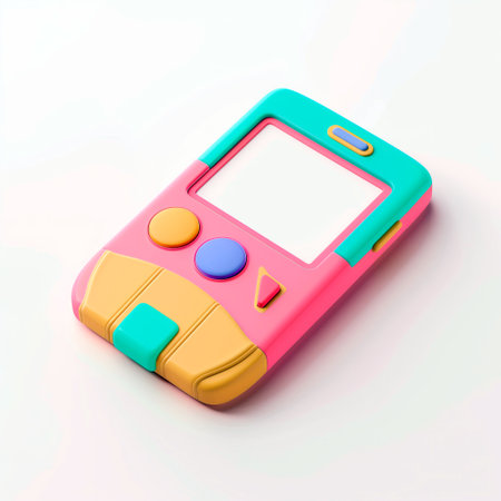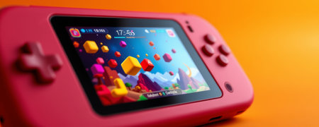 A closeup of classic gaming handheld device displaying colorful game scene with vibrant blocks and playful atmosphere