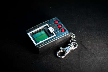 BELARUS, NOVOPOLOTSK - APRIL 25, 2020: Tamagotchi toy on a green background close up