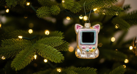 Retro Christmas ornament shaped like a 90s cat-themed digital pet toy hanging on a green Christmas tree with warm bokeh lights for holiday decoration.
