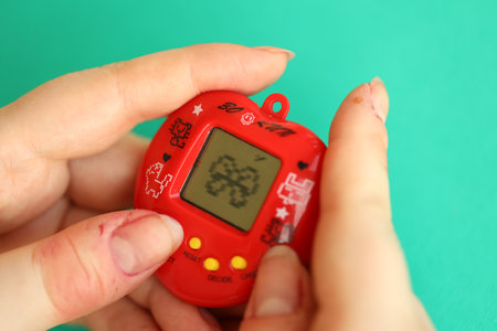 KYIV, UKRAINE - MARCH 9, 2024 Retro pet keychain game tamagotchi in red plastic case in female hands close up