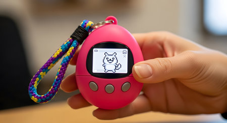 A person's hand holds a pink, egg-shaped virtual pet toy, reminiscent of a Tamagotchi from the 1990s. The small pixelated screen shows a cute digital animal character.