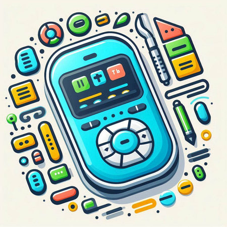 A vibrant 3D of a blue and teal pedometer with a blank screen and colorful buttons, isolated on a white background.