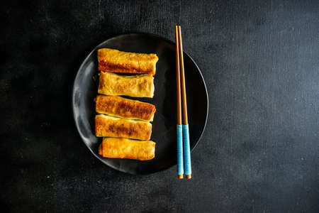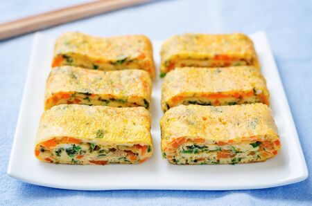 Korean Egg Omelette Roll or Gyeran Mari with Spring Onion and Carrot. Know as Tamagoyaki in Japanese. Copy Space for Text