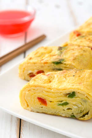 Telur dadar gulung or Tamagoyaki or Japaneses egg roll. Gyeran Mari or Korean Rolled Omelette. fried egg