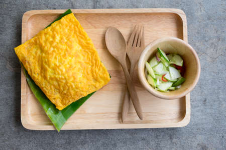 Vietnamese stuffed crispy omelette it called Khanom Buang Yuan, food on banana leaves