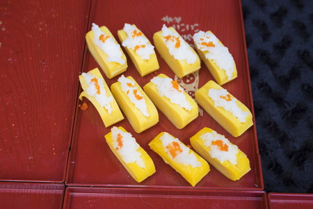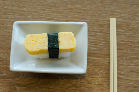 Japanese Tamago (egg) sushi on dish in Japanese resturant
