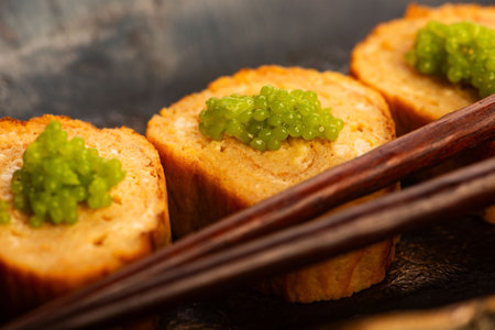 Japanese Tamagoyaki with Green Wasabi Caviar on Ceramic Stand