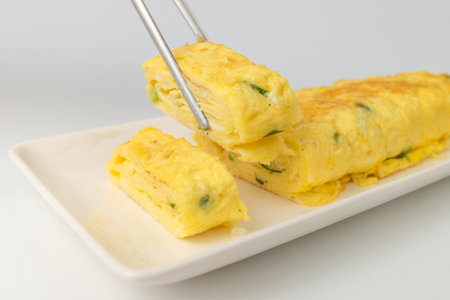 Traditional tamagoyaki Japanese omelette isolated on white background