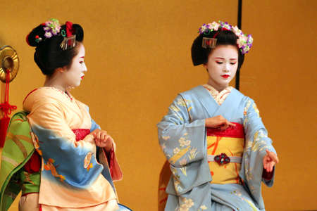KYOTO, JAPAN - 18 May, 2015: Maiko apprentice showing Japanese traditional dance. Maiko is an apprentice geisha. Maikos performing songs, playing shamisen or instruments for visitors on ozashiki.