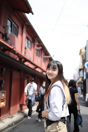 The portrait shows an East Asian woman smiling at the camera while standing on a street in Asakusa, Japan.