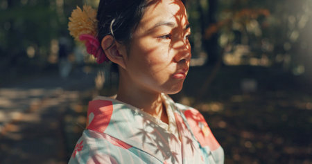 Cherry blossom, park and face of woman with kimono, thinking or outdoor sightseeing in nature with low angle. Culture, inspiration and Japanese girl in spring garden for traditional sakura festival