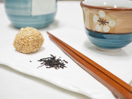 black tea, tea, porcelain, rice cake, chopsticks, white background,