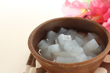 Strawberry rice cake placed on a white background. Warabimochi is a traditional Japanese sweet.