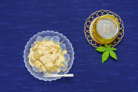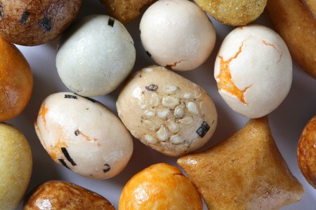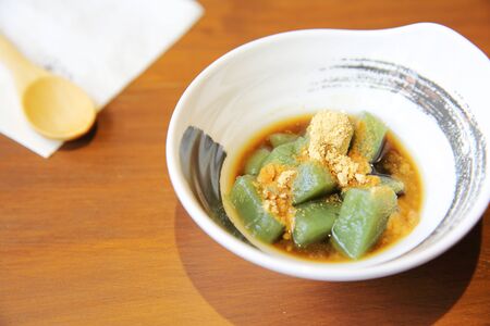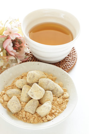Japanese cuisine: stiffed seaweeds called Okyuuto or Okyuto with toasted soybean flower and sugar
