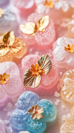 Colorful floral candies adorned with golden accents create a whimsical sweet delight