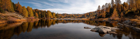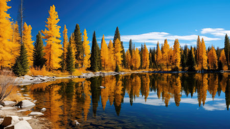 Tranquil autumn forest with golden trees reflected in calm water under blue sky. Scenic mountainous view depicting harmony between natures elements in fall.