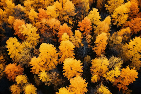 Aerial view of yellow coniferous trees in autumn forest.