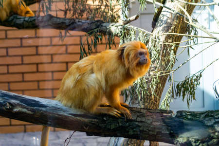 A small monkey golden lion tamarin sits near a window on a tree and looks at people who came to the Novosibirsk zoo to look at the beasts