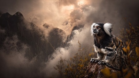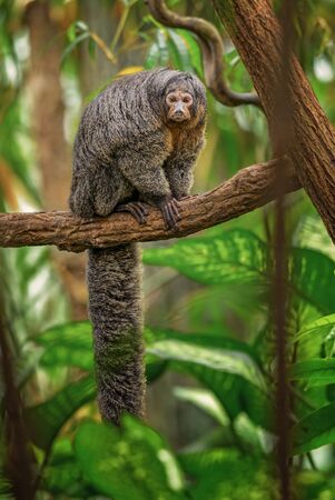 Really spectactular capture of a tamarin monkey sitting on a tree branch.