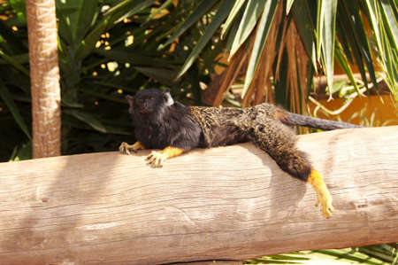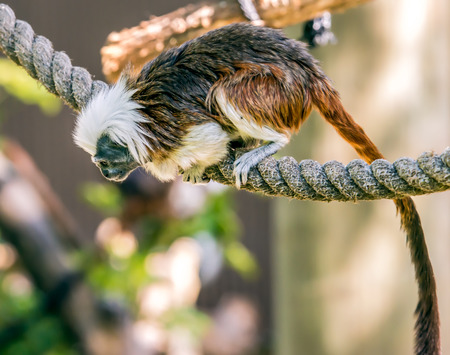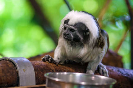 Monkey titi cotton-top tamarin sitting on wood board in zoo