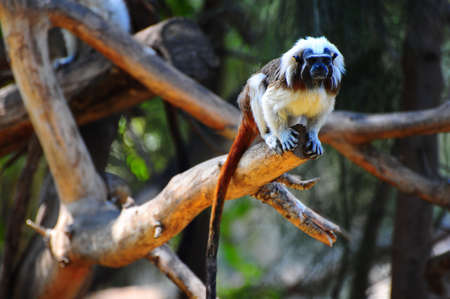 Monkey titi cotton-top tamarin sitting on tree in zoo
