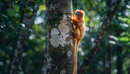 A rare golden langur monkey with bright orange fur clings to a tree trunk in a vibrant, sun-dappled jungle.